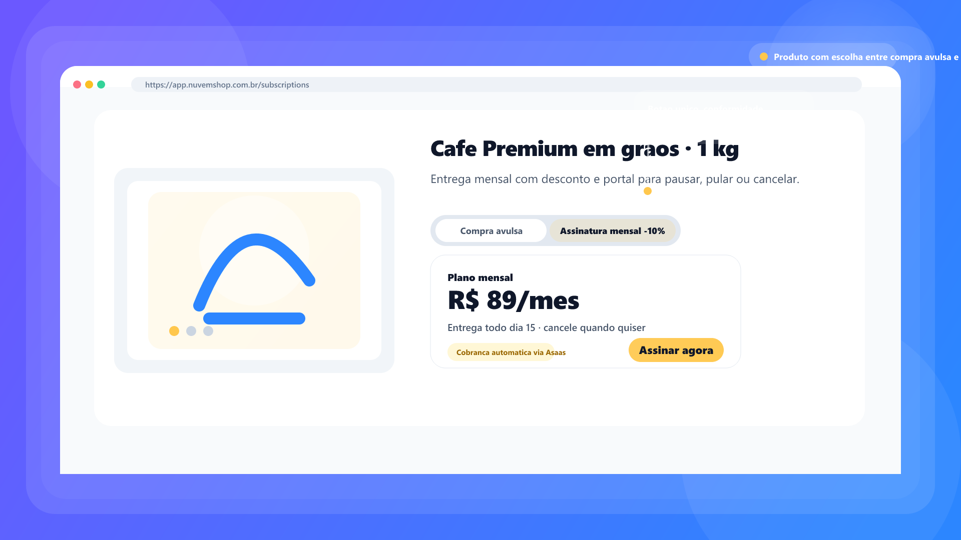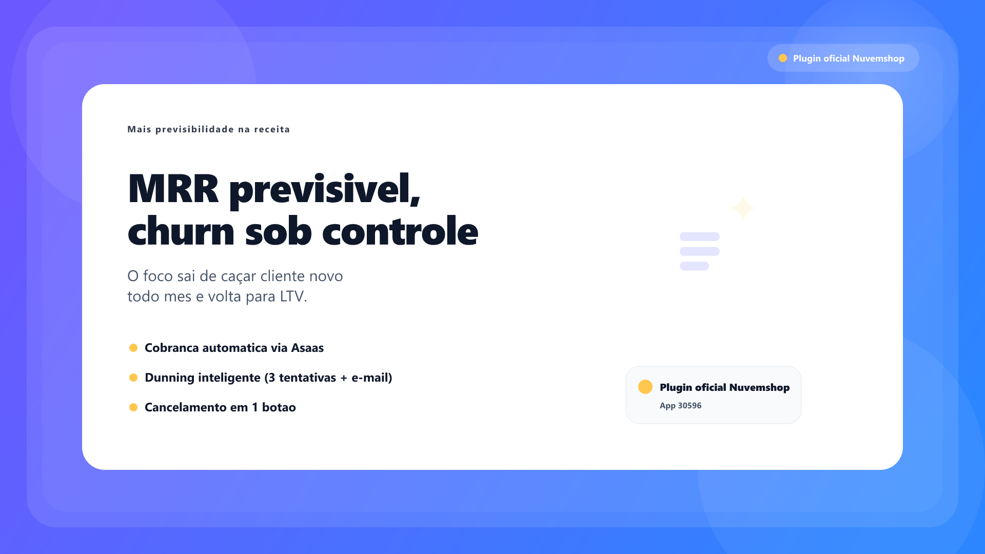 Plugin oficial Nuvemshop pra clube de assinatura. Toggle "Assinar" na página do produto, cobrança recorrente via Asaas (cartão, Pix, boleto), dunning automático e cancelamento botão único conforme Lei 14.532/2023.