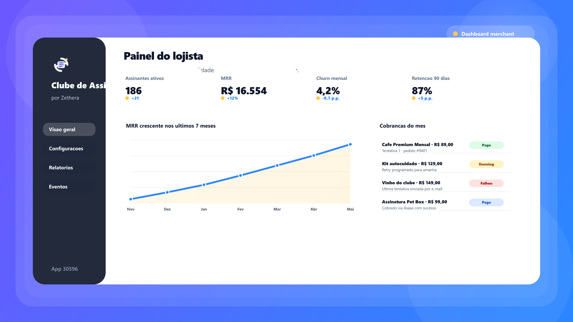 - ✓Dashboard com MRR, churn mensal, retenção 90 dias e cobranças falhadas