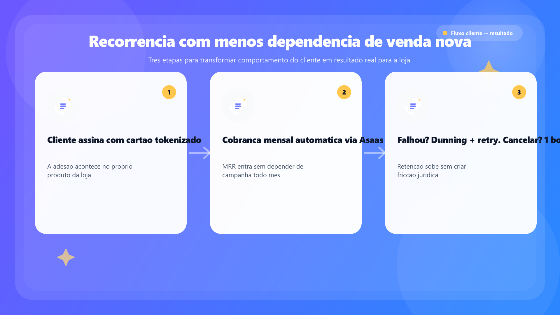 Cria assinatura na Asaas com o cartão tokenizado. Define data da próxima cobrança conforme cadência. Lojista vê tudo no dashboard MRR.